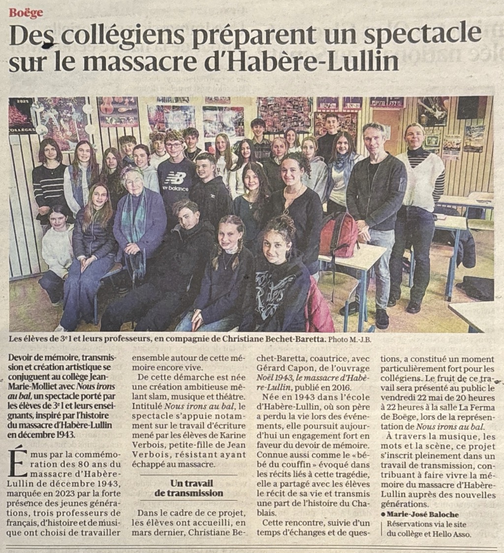 Cet échange, particulièrement émouvant, a permis aux élèves de découvrir un témoignage direct lié au massacre d’Habère-Lullin de décembre 1943. À travers son récit et son engagement pour le devoir de mémoire, Christiane Bechet-Baretta a profondément marqué les élèves, qui poursuivent actuellement leur travail de création mêlant slam, musique et théâtre.