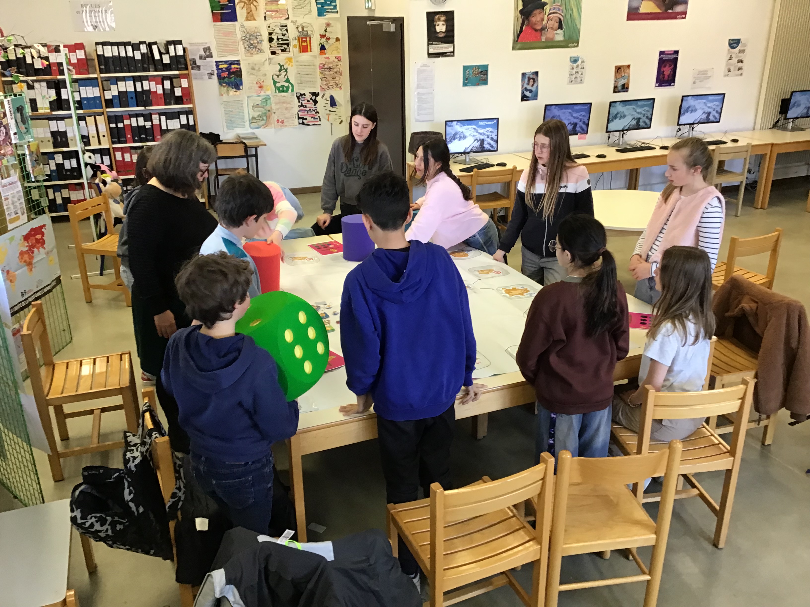 Puis, ils ont participé à un grand jeu par équipes. Autour d'un plateau géant, ils se sont "affrontés" en répondant à des questions sur les livres lus et sur le circuit du livre, ou en relevant différents défis ( par exemple: lire un extrait en chantant, faire deviner en mimant, compléter un proverbe...).